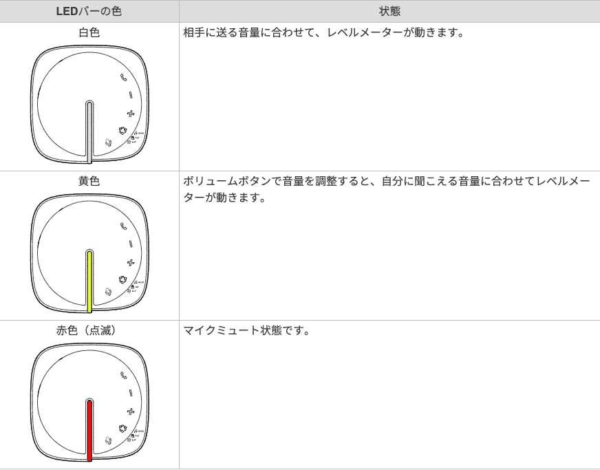 LED表示は以下のようになっています。視覚的にマイクがどのような状況なのか把握しやすくて良いですね。