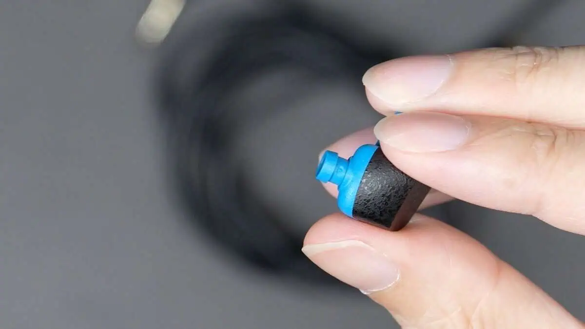 ノズル部はこんな感じで本体と同じ樹脂筐体。ノズルはやや短めですが、他社のイヤーピースでも問題なく装着できます。