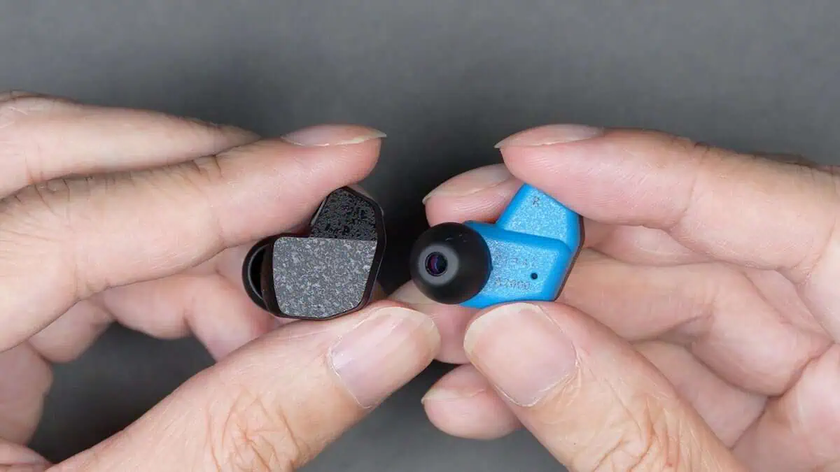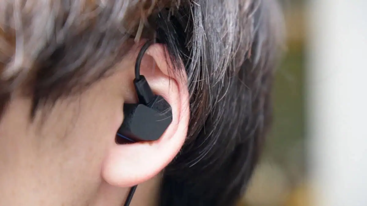 実際に装着してみるとこんな感じ。耳との接触面積を限定して圧迫感を減らす方向性に振っているとのことですが、たしかに他のIEM型モデルと比べると閉塞感は少なめ。