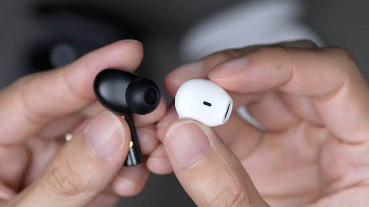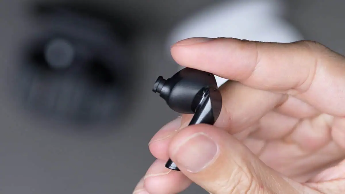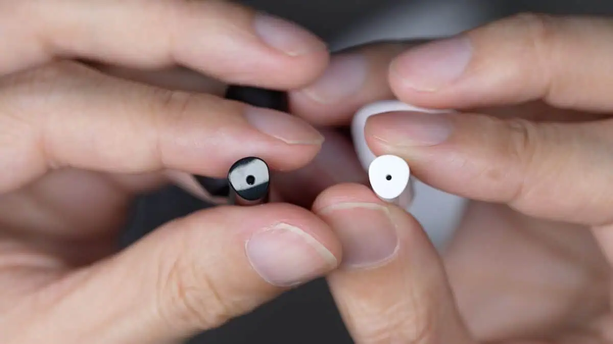 イヤホン本体はスティック型と呼ばれる形状で、下部にアンテナが伸びたようなデザインになっています。