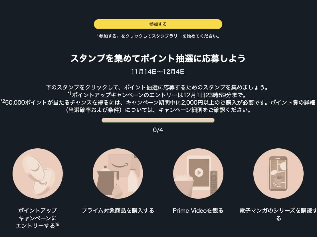 こちらのスタンプラリーはプライム会員のサービスを利用すると、最大50,000ポイントが当たるかも?というキャンペーンです。