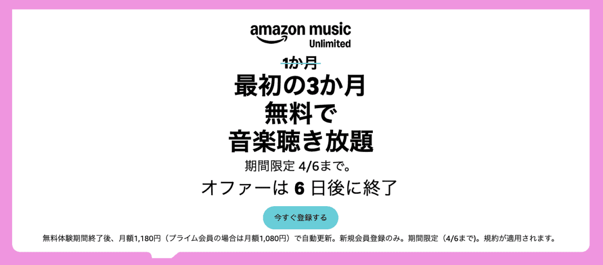 Amazon Music Unlimitedを3ヶ月無料で使えるお得なキャンペーンも開催。こちらは2026/4/6(金)までです。