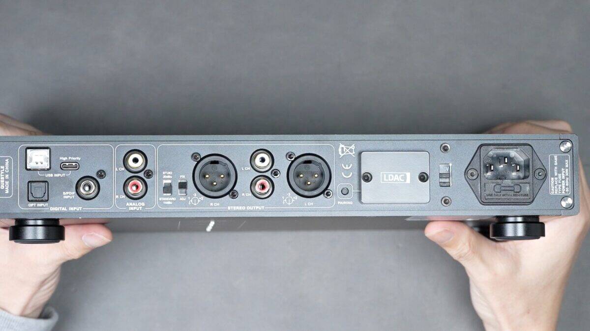 背面パネルは左からUSB-B、USB-C、OPT IN、S/PDIF IN、ANALOG IN(RCA)、ANALOG OUT(XLR 3pin×2、RCA)、ペアリングボタンとBluetoothアンテナがそれぞれ備わっています。