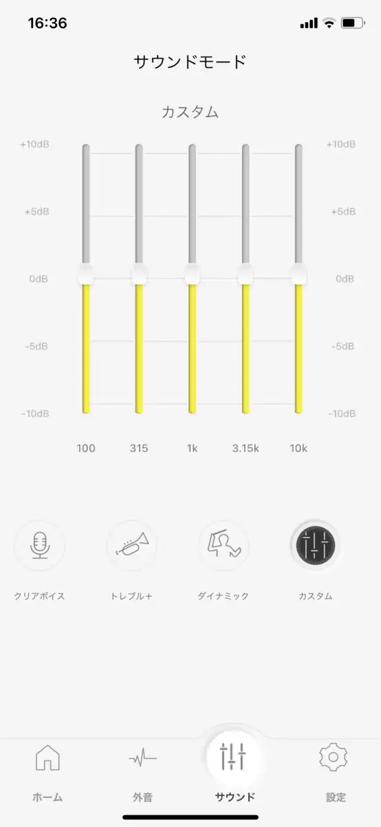 サウンドモードではプリセットで用意されているイコライザーと、5バンドのカスタムイコライザーが用意されています。