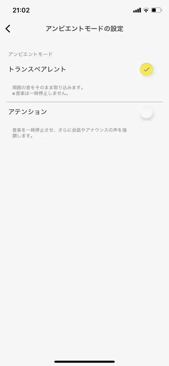 また外音取り込みモード時に周囲の音をそのまま取り込む『トランスペアレント』と、音楽を一時敵視して声を強調する『アテンション』の2種類のモードを選ぶこともできます。