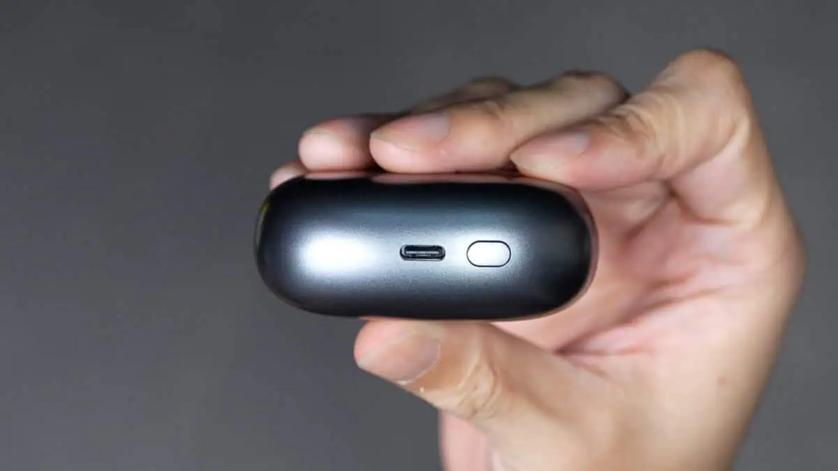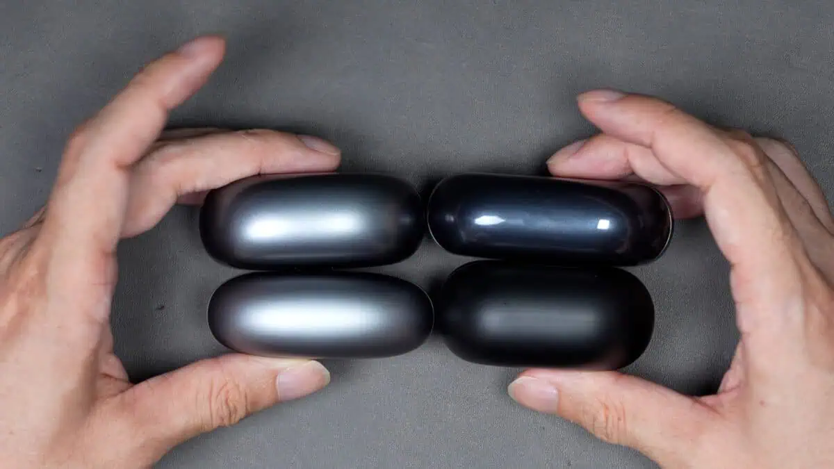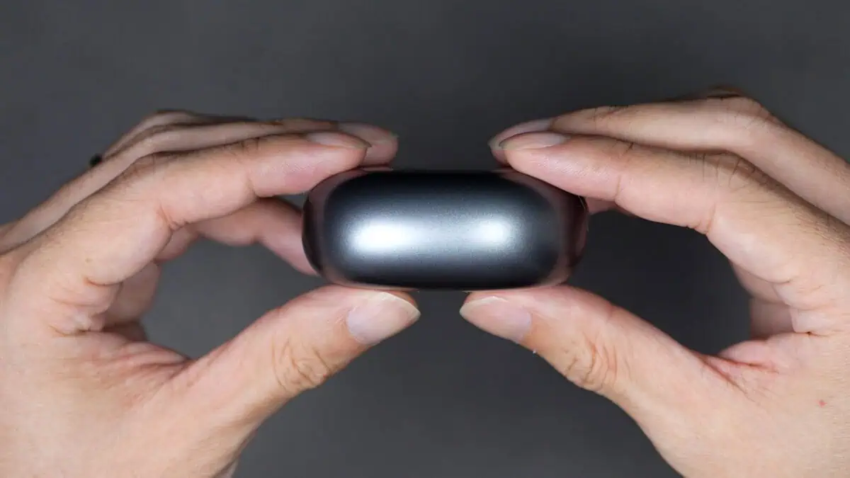 充電ケースはイヤーカフ型としては一般的なサイズ感。メタリックシルバー色で指紋や傷も目立ちにくく、高級感も少しあるようなデザインになっています。