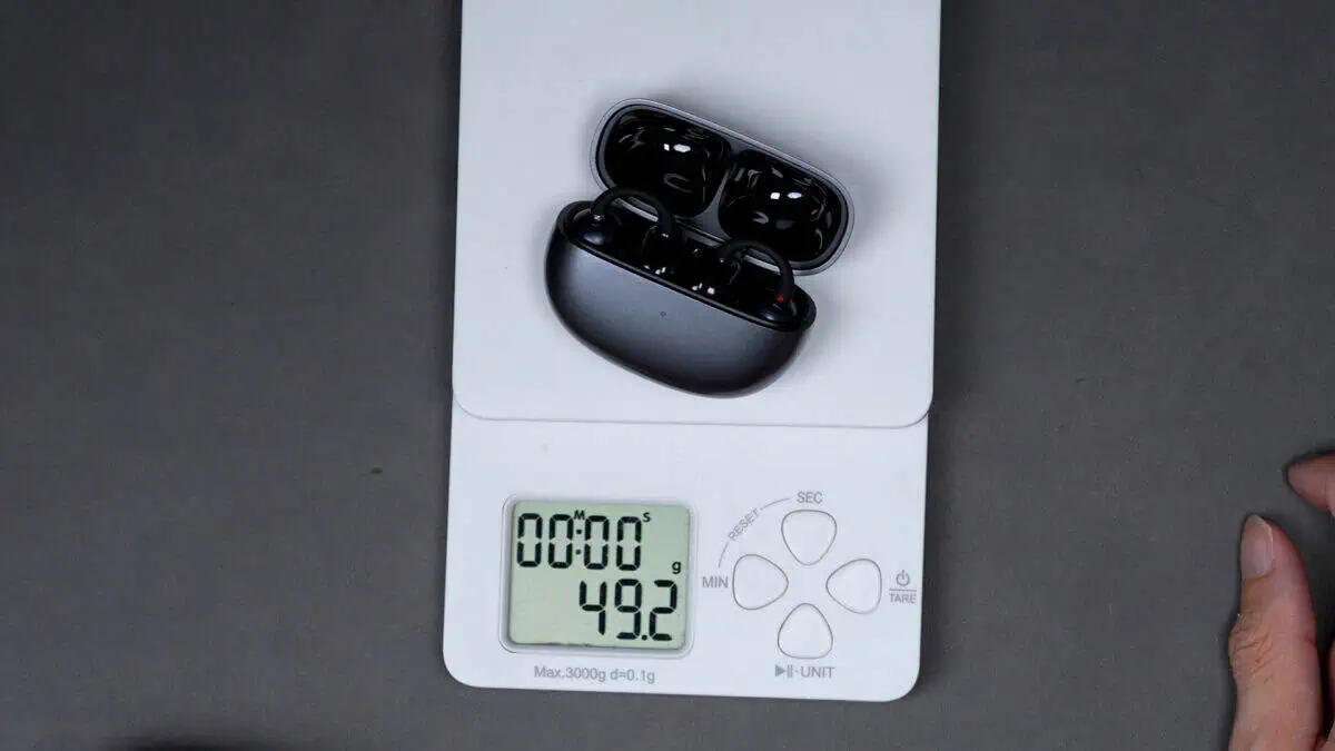 最後に重さですが、総重量は49.2g、本体片耳の重量は5.7gです。イヤーカフ型としては一般的な軽さですね。