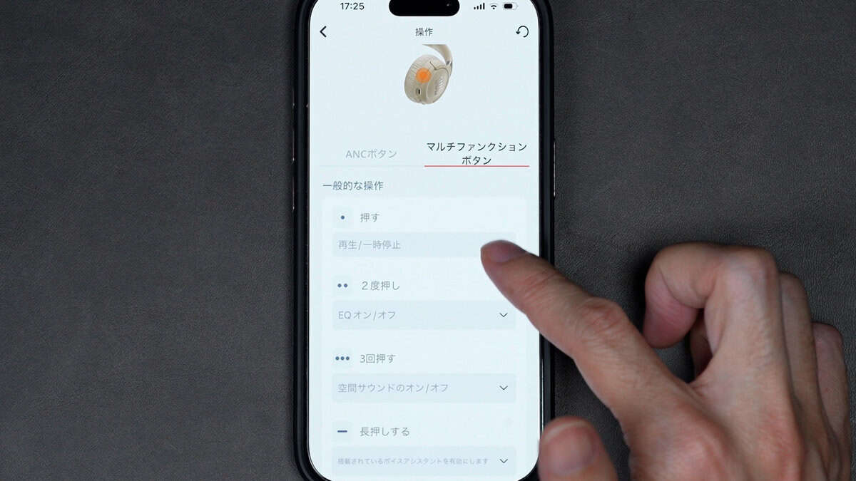 また、アプリでマルチファンクションボタンの「2回押す / 3回押す / 長押し」は「EQ / 空間サウンド ボイスシスタント」の3つから操作を自由に割り振りこともできます。