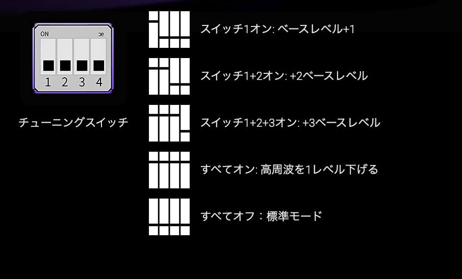以下は公式の説明ですが、スイッチを上げていくことで、低音の調整を行う感じですかね。