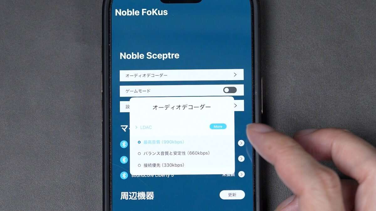 Noble FoKusアプリでは、LDACの接続モードを細かく切り替えることができます。