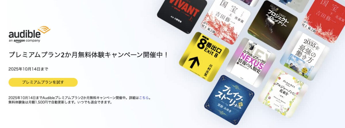 聴く読書サービスAudibleも月額1,500円のところ、2025年10月14日まで2ヶ月無料キャンペーンを実施中。