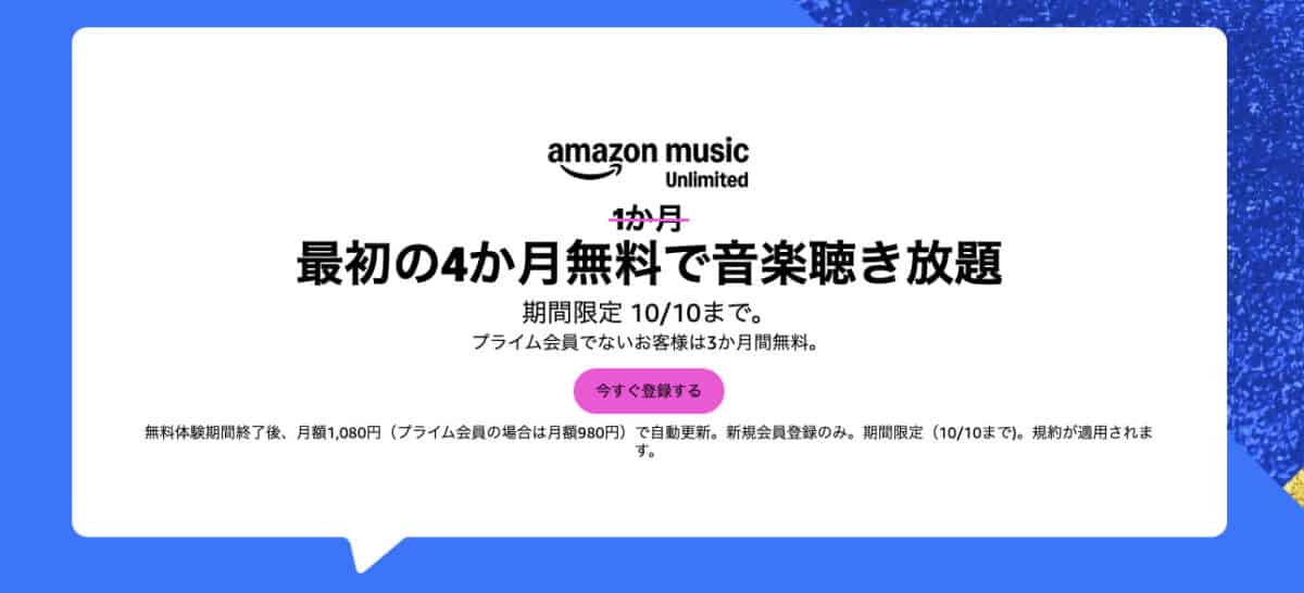 Amazon Music Unlimitedをプライム会員であれば4ヶ月無料で使えるお得なキャンペーンも開催。こちらは2025/10/10(金)までです。