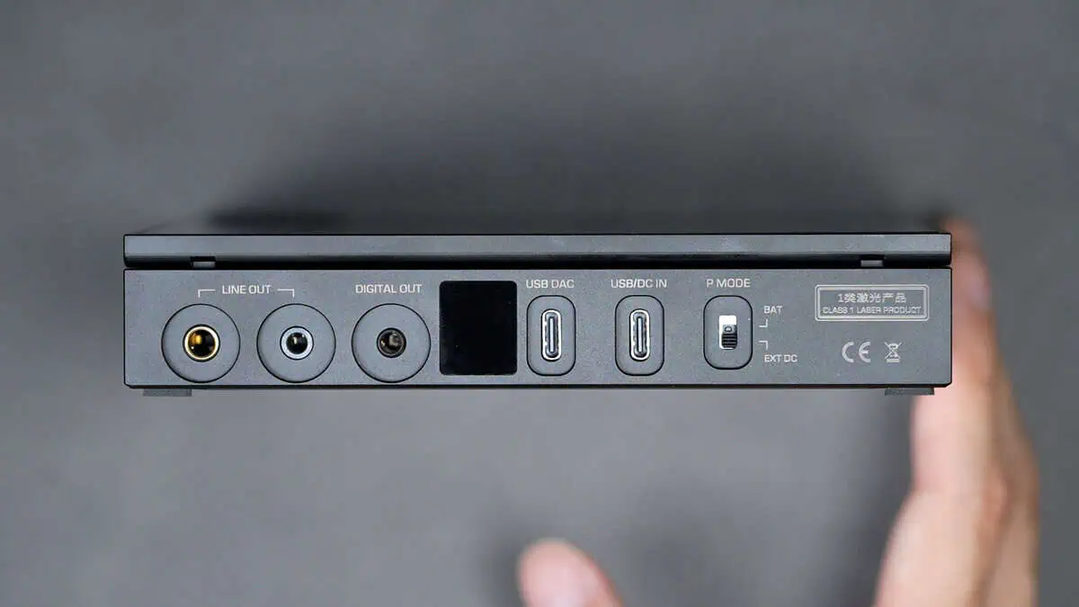 背面には3.5mm / 4.4mm LINE OUT、DIGITAL OUT、そしてUSB0-DAC用のUSB-C端子と電源入力用のUSB-C端子、一番右側にはバッテリー駆動と電源駆動を切り替えるスイッチがあります。