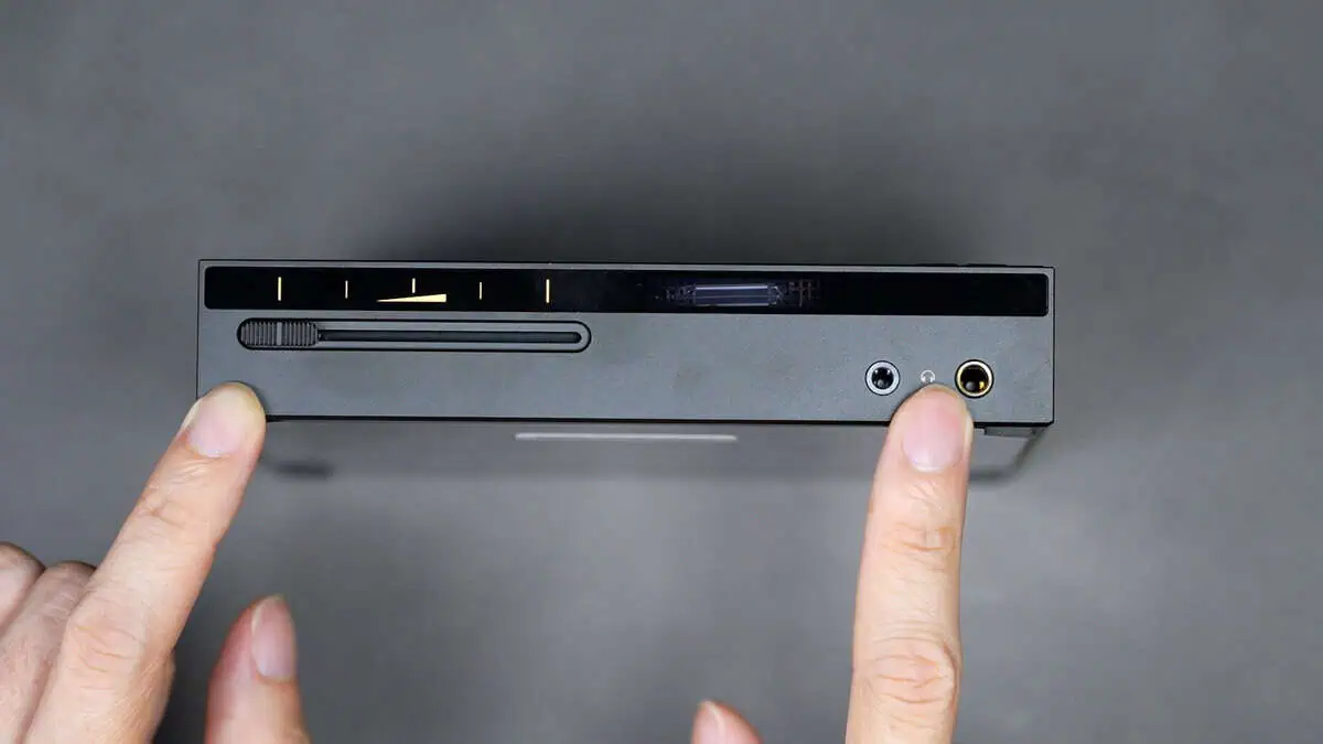 前面にはボリュームスライダーと一般的な3.5mmイヤホンジャック、そして4.4mmバランス端子が備わっています。