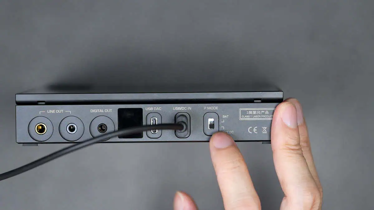 筐体背面の「P MODE」を「EXT DC」に切り替えて背面のUSB DCINにUSB-Cの充電ケーブルを指すことで、バッテリー駆動からDC外部電力入力のモードに切り替わり、「最大1220mW@32Ω」の高出力で聴けるようになります。