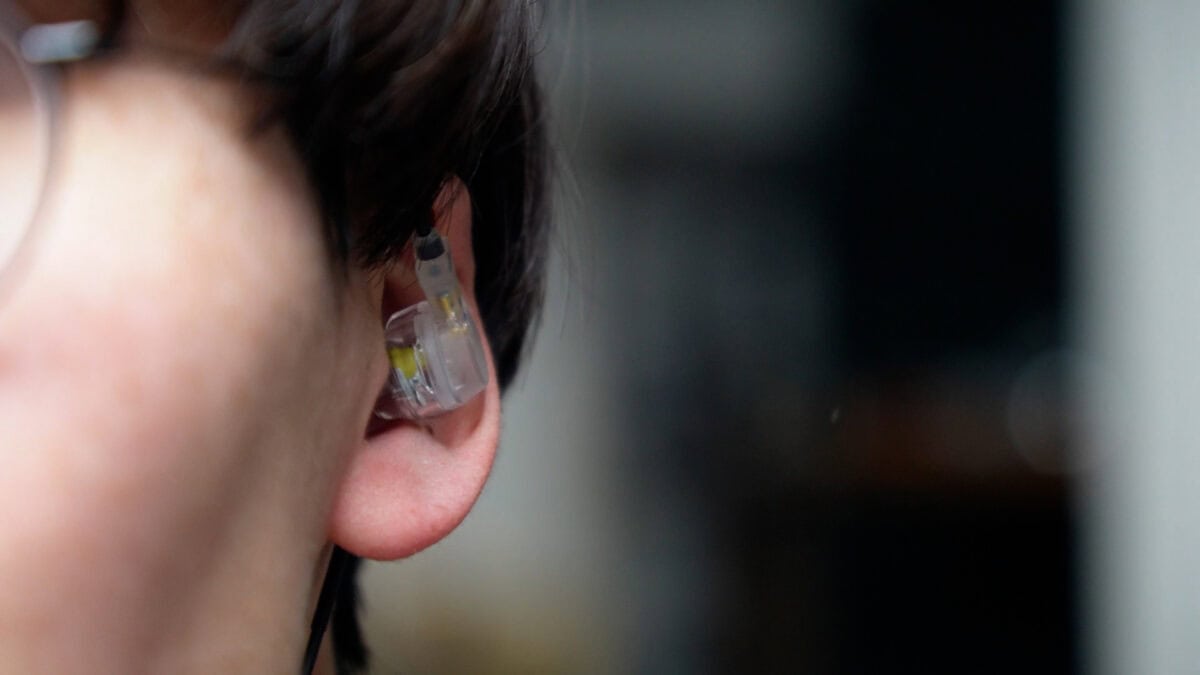 実際につけてみるとこんな感じ。見た目は完全にFitEarのイヤモニ。この写真だけ見ればカスタムIEMを作ったみたいでテンションが上がりますね。STAGEARカスタム。
