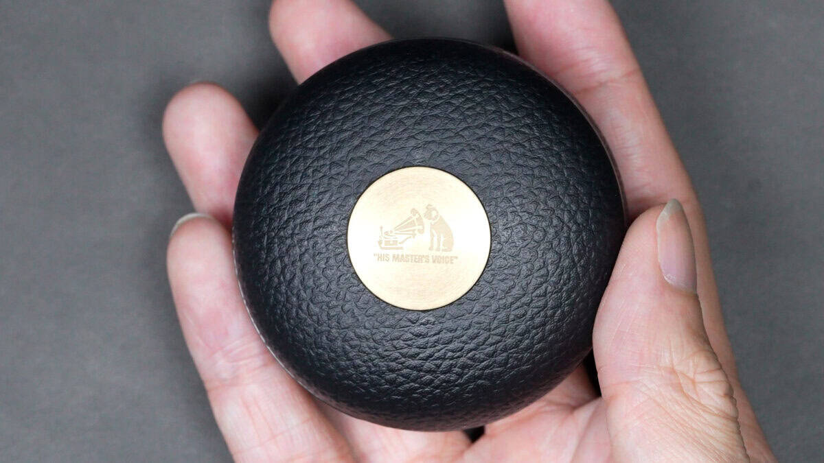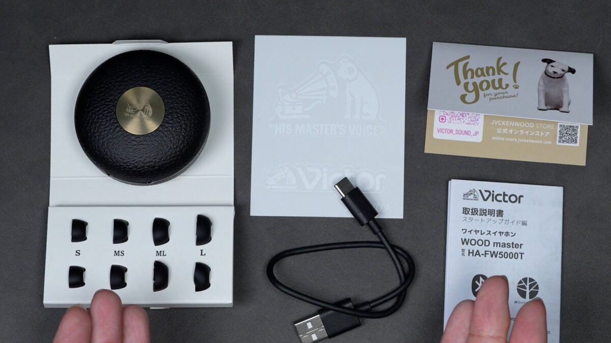 充電ケースは“楽器ケース”をイメージしたような高級感のある佇まい。表面はレザー調のテクスチャで、ビクター犬の意匠も入っていて、所有欲に振り切ってます。