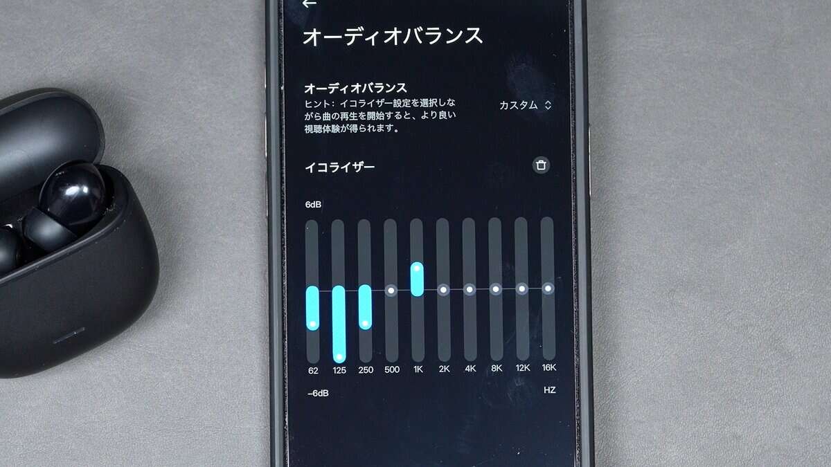 プリセットでデフォルトの「バランスの取れたサウンド」の他に、「低音強化」「音声増幅」「高音強化」「音量をあげる」の4種と、カスタムイコライザーの合計6種類が使えます。